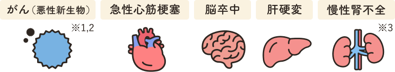 - 5疾病とは、悪性新生物・急性心筋梗塞・脳卒中・肝硬変・慢性腎不全をいいます。詳しくは5疾病についてをご覧ください。