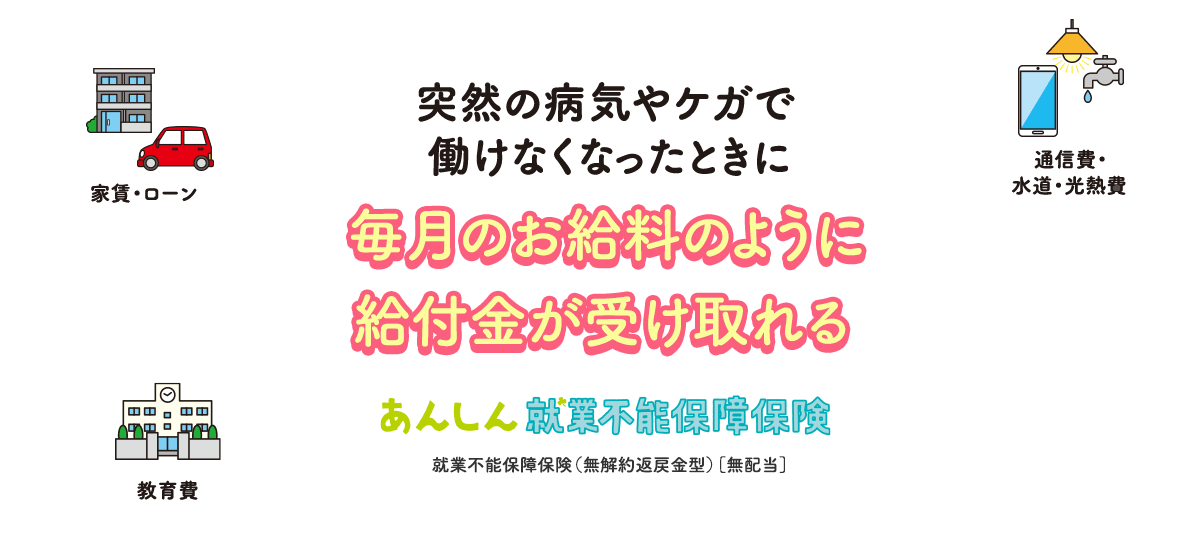 - ●ご契約年齢:30歳(男性) ●保険期間:65歳まで(35年) ●保険料払込期間:65歳まで ●給付金支払期間:保険期間満了日まで ●最低支払保証期間:2年 ●基準給付金月額:10万円 ●非喫煙者優良体保険料率適用 ●特定疾病保険料払込免除特則 付加